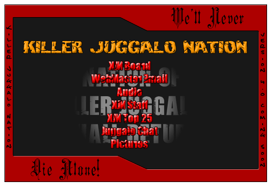 Disclaimer: All files located on this server are the copyright (if they have a copyright on the content) of their respective owners. Killer Juggalo Nation takes no responsibility for any misuse of these files. KJN does not place a copyright on anything on this site...because false copyright statements is a fellony...and the staff doesnt want to waste money geting this shit copyrighted!... all content is owner of its respective owner. If you do not like our terms or use or disclamer... DO NOT ENTER this website. By enter this website or downloading or looking at any file on the kjnserver you agree that u will and wont take any legal actions againt KillerJuggalos.Net or the owners/staff members of this site or the host of this site...http://www.phpwebhosting.com if u have a problem with something on here dont enter!. Enter at ur own risk...